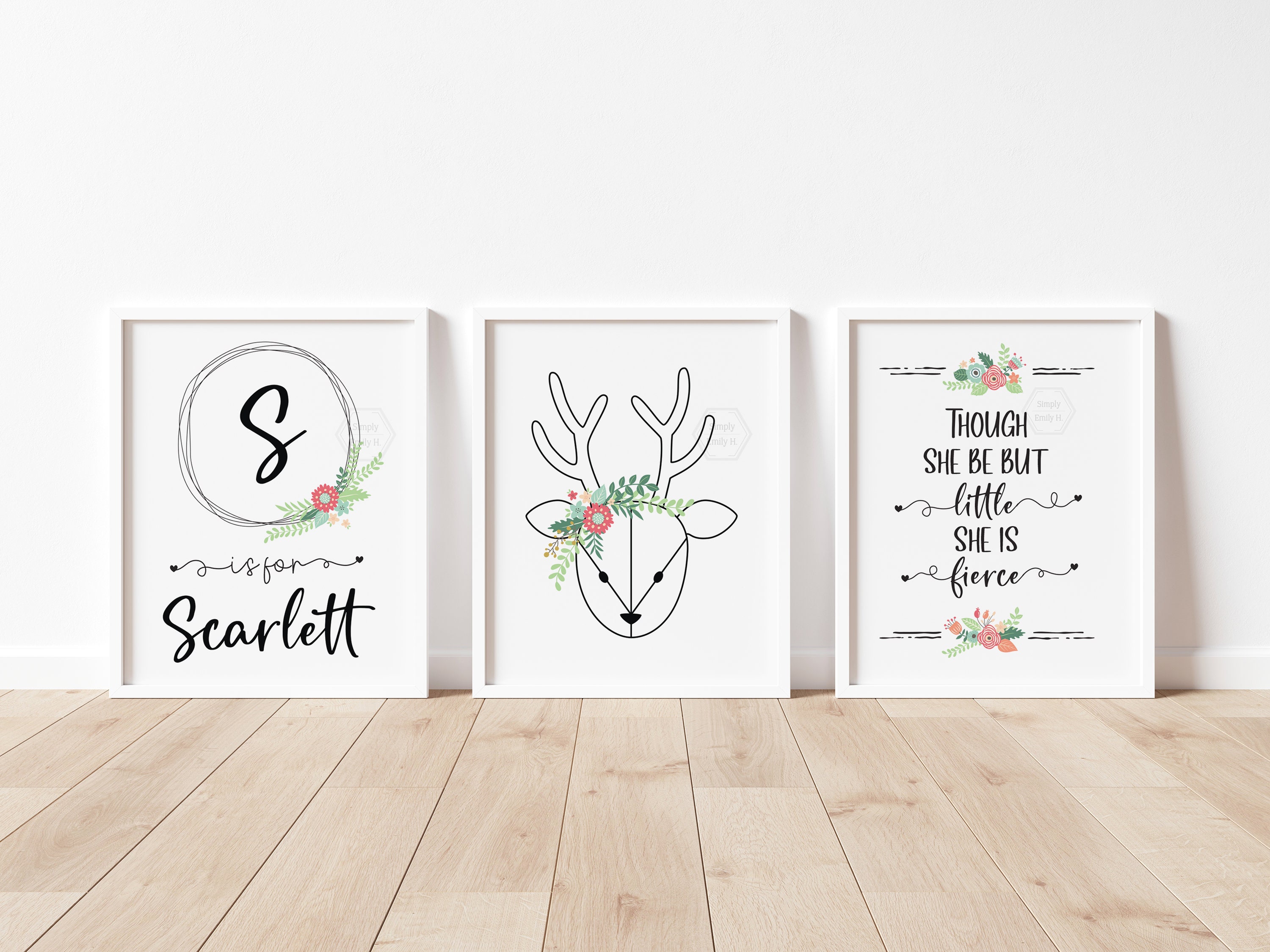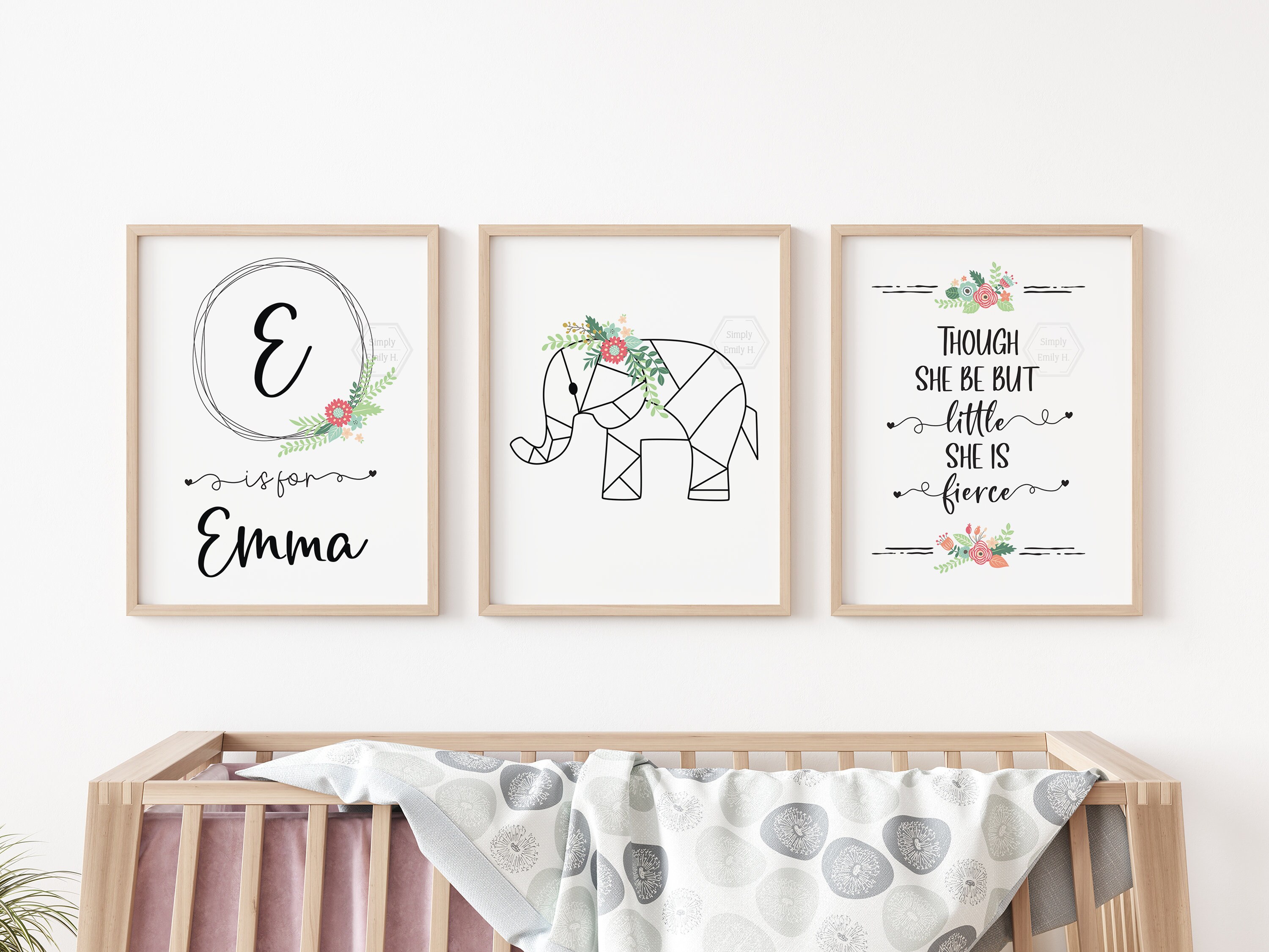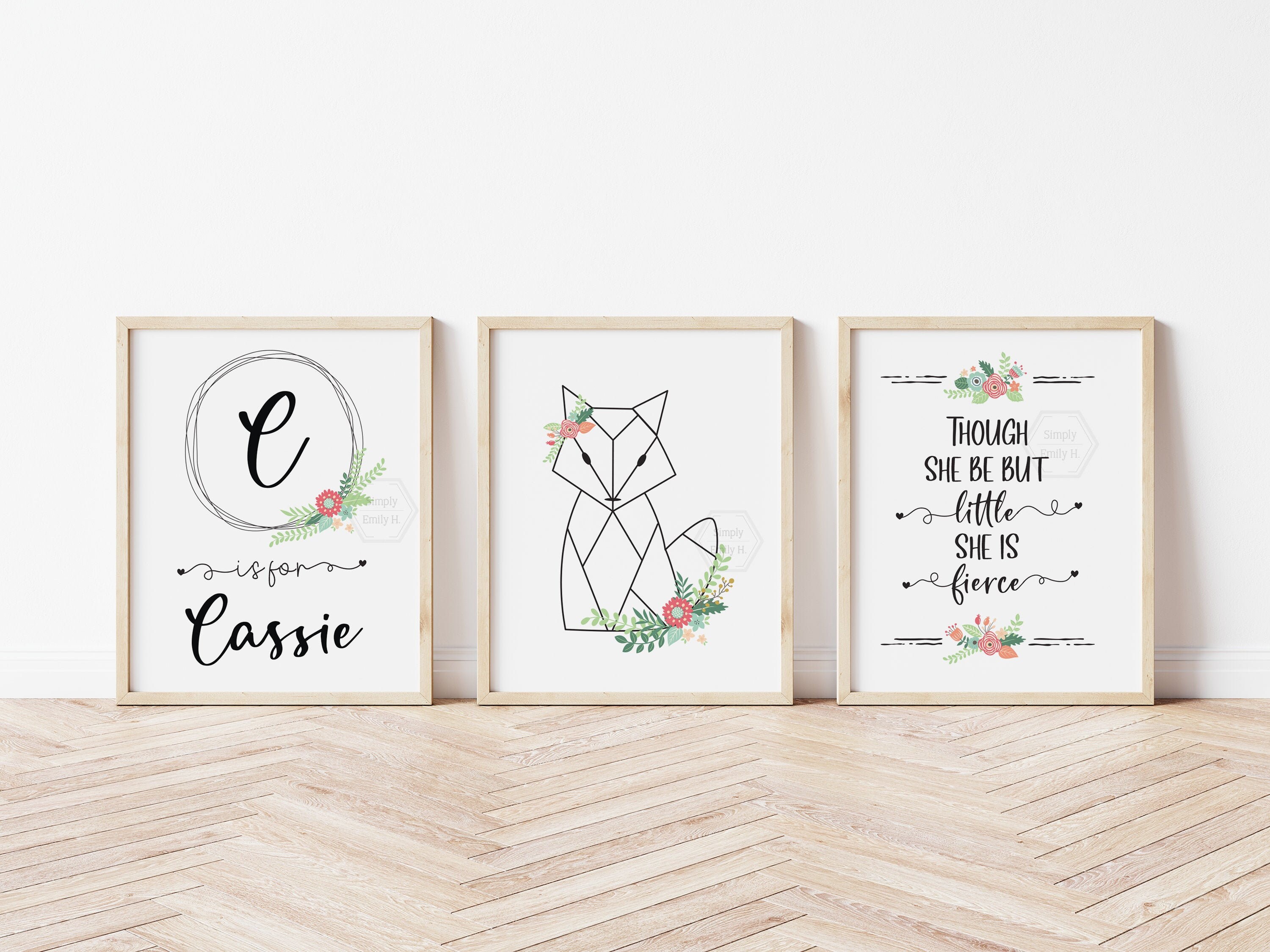 This listing includes a personalized monogram, one animal print of your choice, and "Though she be but little, she is fierce" print. This group is perfect to hang in a nursery, kid's room, or give as a present!