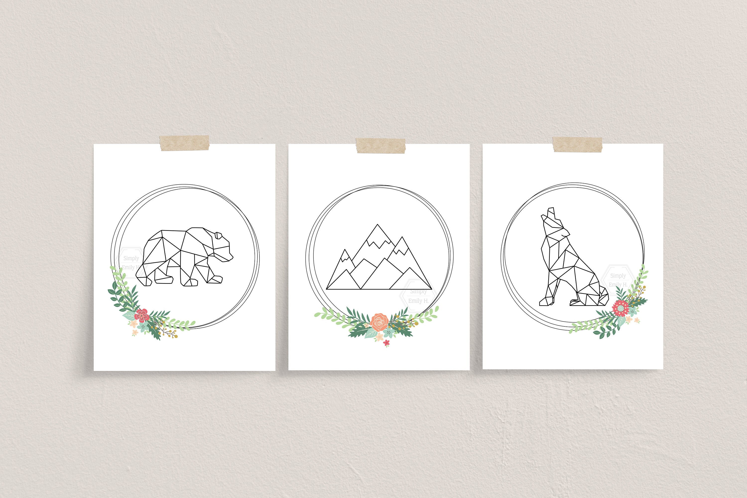Set of 3 Geometric Boho Style Prints: bear, mountains, and wolf