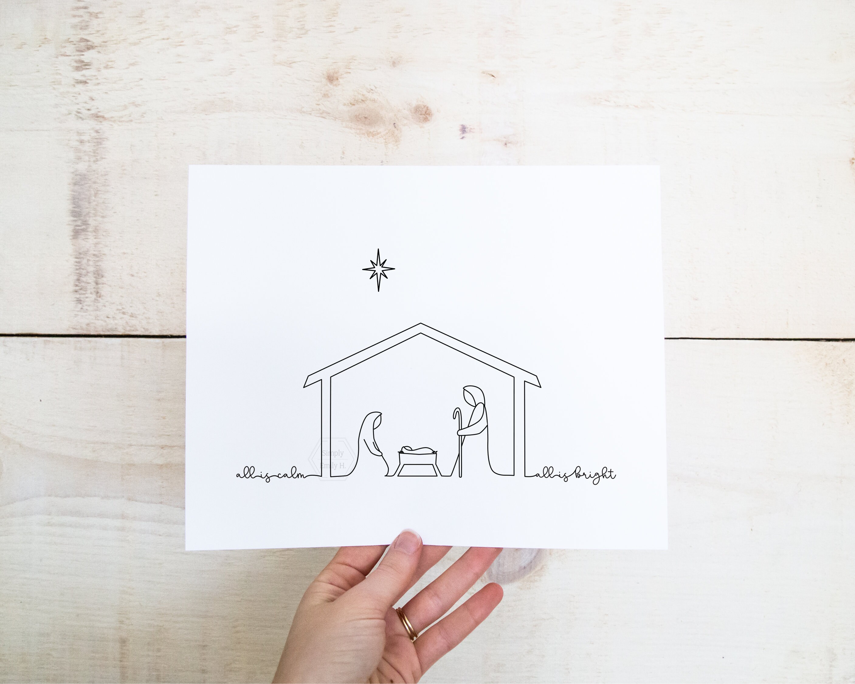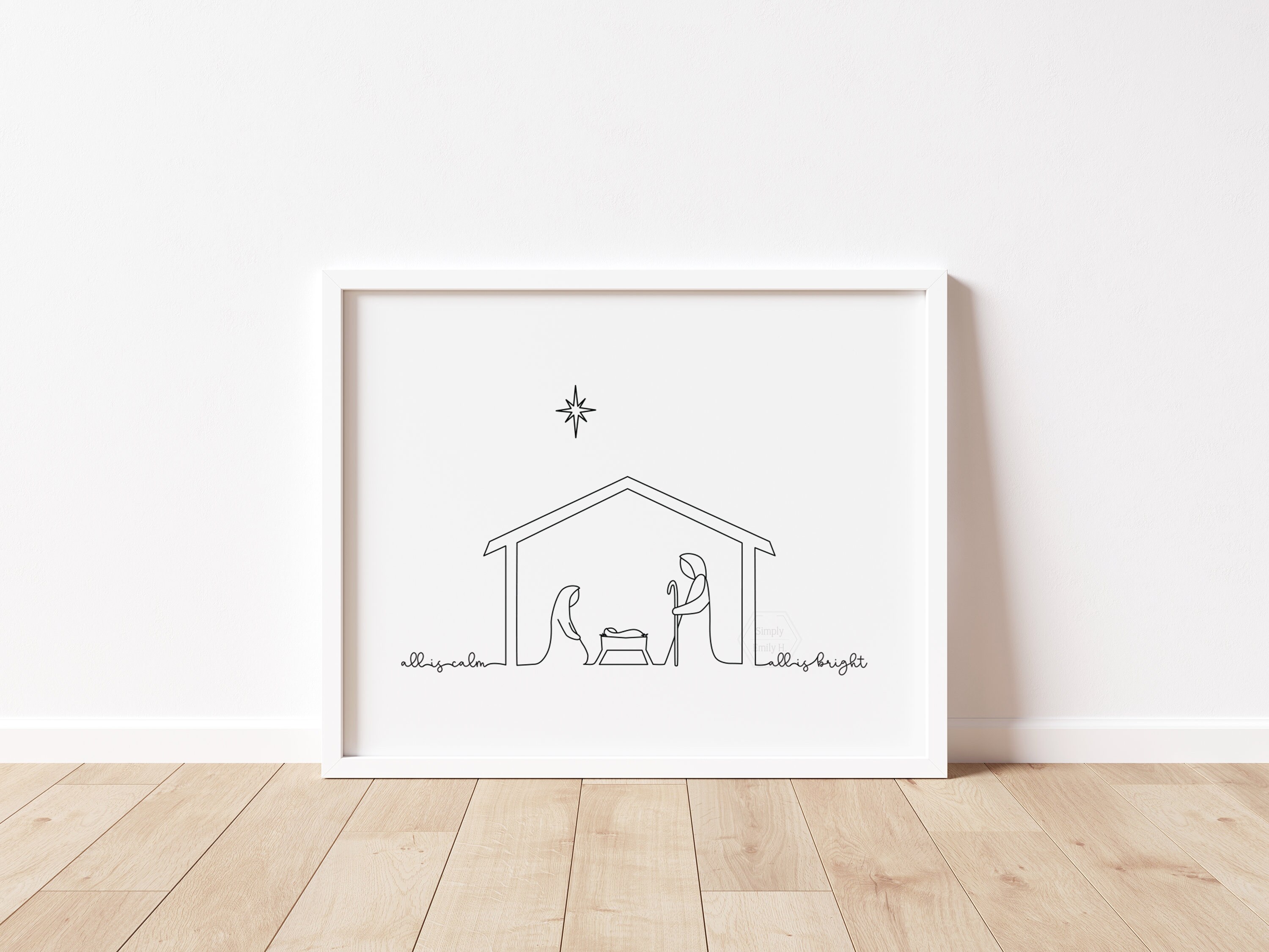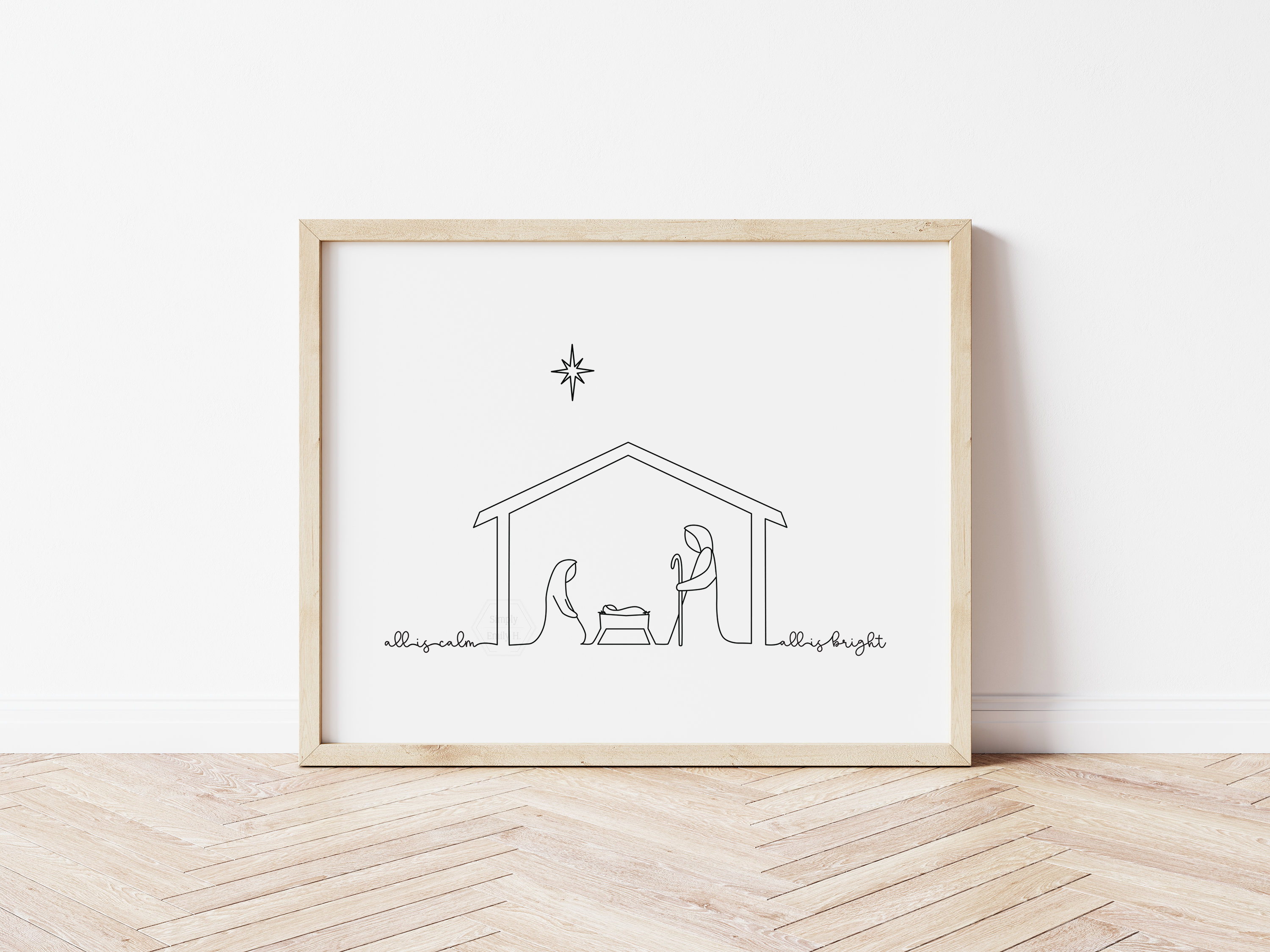 Celebrate the warmth of the Christmas season with this beautiful art print. This print features a striking line art nativity and the lyrics from Silent Night, "all is calm, all is bright". This print is the perfect addition to your holiday decor, and displays beautifully anywhere in your home.